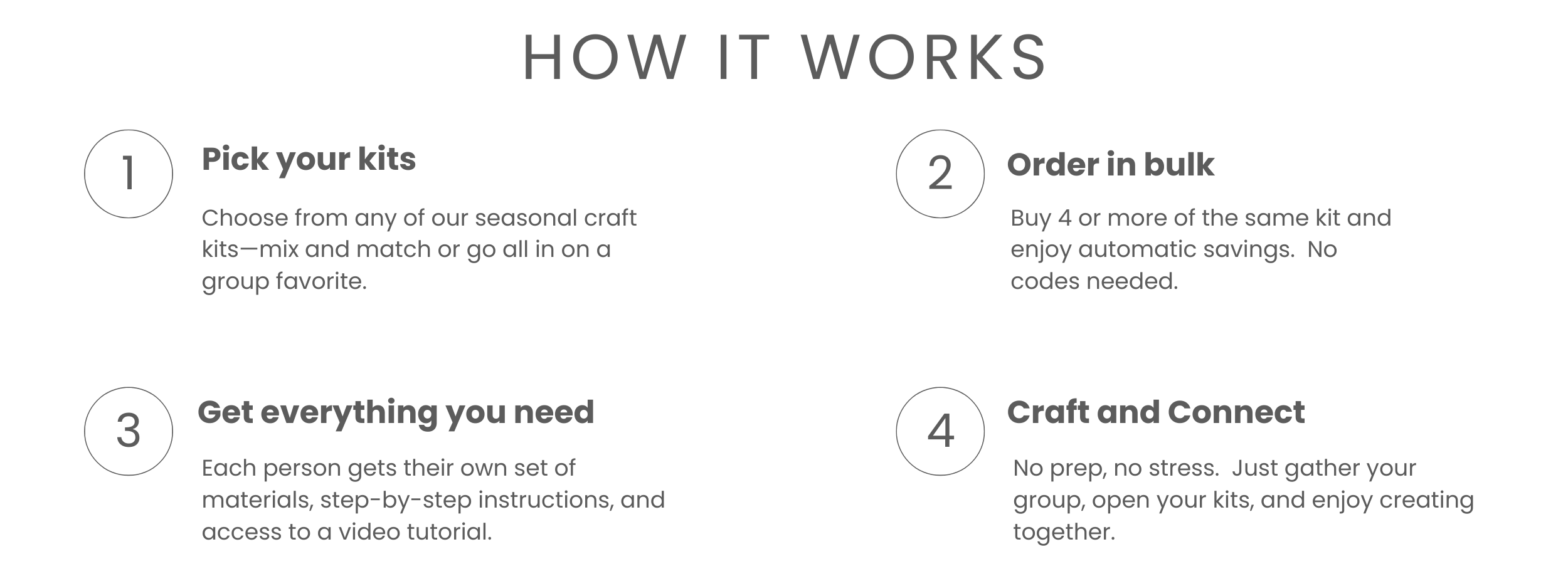 We understand that hosting can be overwhelming. Our DIY seasonal craft kits are designed to take the stress out of planning. Every kit comes with everything you need — just add your people.